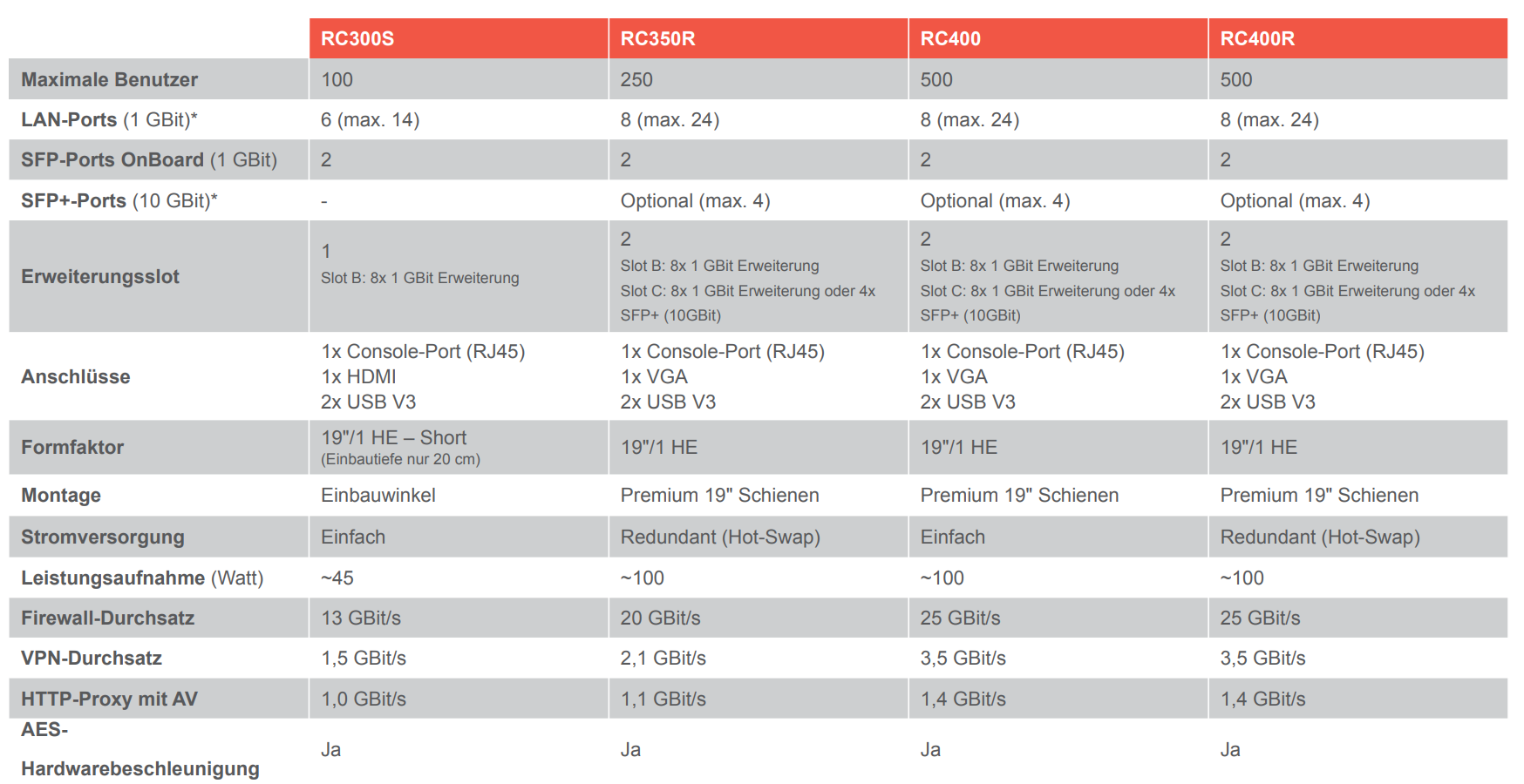Zwei Einschübe bei den UTM-Firewalls der Enterprise-Klasse ermöglichen die Aufnahme von Erweiterungskarten (ein Einschub bei der RC300S). Zur Auswahl stehen Karten mit 8-Port Gbit Ethernet (RJ45) und 4-Port für SFP+ 10 Gbit Module (SR oder LR).