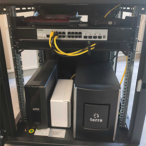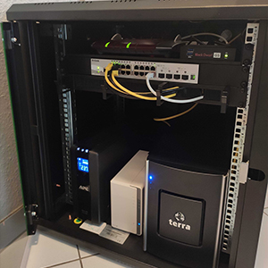 Zuallererst haben wir den Serverschrank, das Herz jeder IT-Infrastruktur, aufgebaut sowie diesen mit Fachböden, einer unterbrechungsfreien Stromversorgung und Rack-Steckdosenleisten bestückt. Hier ist nun alles übersichtlich und kompakt an einem Ort zu finden, was für das reibungslose Arbeiten unabdingbar ist. Darunter der Server, Firewall und Switches.
